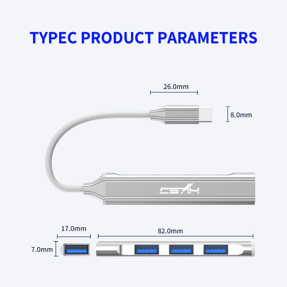 - USB C HUB: The 4 in 1 usb-c hub multiport adapter equipped with 3 x USB2.0 Ports, and 1 x USB3.0 Port. USB C hub has perfectly combined all the functions you need. Plug and play, no software, drivers or complicated installation required.